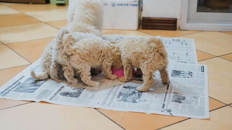 5 cu cậu đều khoẻ mạnh, nặng trên 1kg (bạn nâu nặng nhất 1.3 kg), đã mọc răng và ăn được cháo thịt băm. Mình múc hai thìa cháo to đổ vào khay nhựa, xong rải sẵn vài tờ báo ra sàn, đề phòng các bạn có lao vào ăn hùng hục xong lỡ dẫm chân vào khay hay đạp đổ thì không phải dọn mấy.