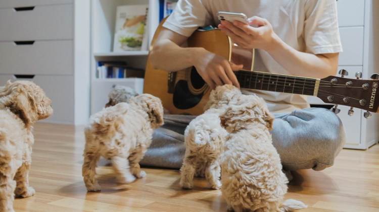 Nghỉ ngơi một lát rồi mình ngồi tập đàn guitar. Các bạn chó con lúc đầu giật mình khi nghe thấy mình gảy đàn, nhưng được một lúc thì quen dần tiếng, thế là không ngại nằm gần mình, thậm chí là nằm trên đùi, lúc mình đang tập đàn.