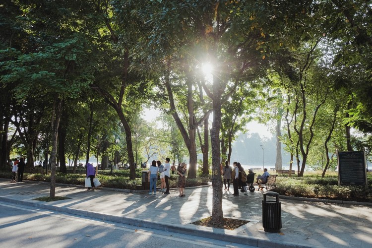 Trước khi hẹn gặp hai đứa bạn buổi chiều, mình có đi dạo một chút ở Hồ Gươm. Khi đang đi ngược dòng người (từ Hàm Cá Mập đi ngược về Tràng Thi), mình chợt nhận thấy có một chỗ mà ở đó ánh nắng chiếu rọi xuống mặt đường qua những tán lá cây, và nó đã khiến mình phải dừng chân lại để cảm nhận ánh nắng của buổi chiều thu. Trước giờ toàn đón ánh nắng buổi sáng sớm ban mai, chứ hiếm khi đón nắng buổi chiều, thế nên cảm giác rất mới mẻ. Thật tuyệt.