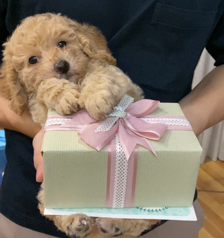 Món quà này còn đặc biệt hơn khi người trực tiếp trao tận tay mẹ lại không phải là hai anh em mình, mà là bạn cún con Suga. Tội cho Suga là lúc đó đã quá 10 giờ, nên cu cậu đang ngái ngủ, được một lúc là người lại cứ xiên vẹo, em trai mình phải giữ liên tục. Cơ mà trông đáng yêu vô cùng!
