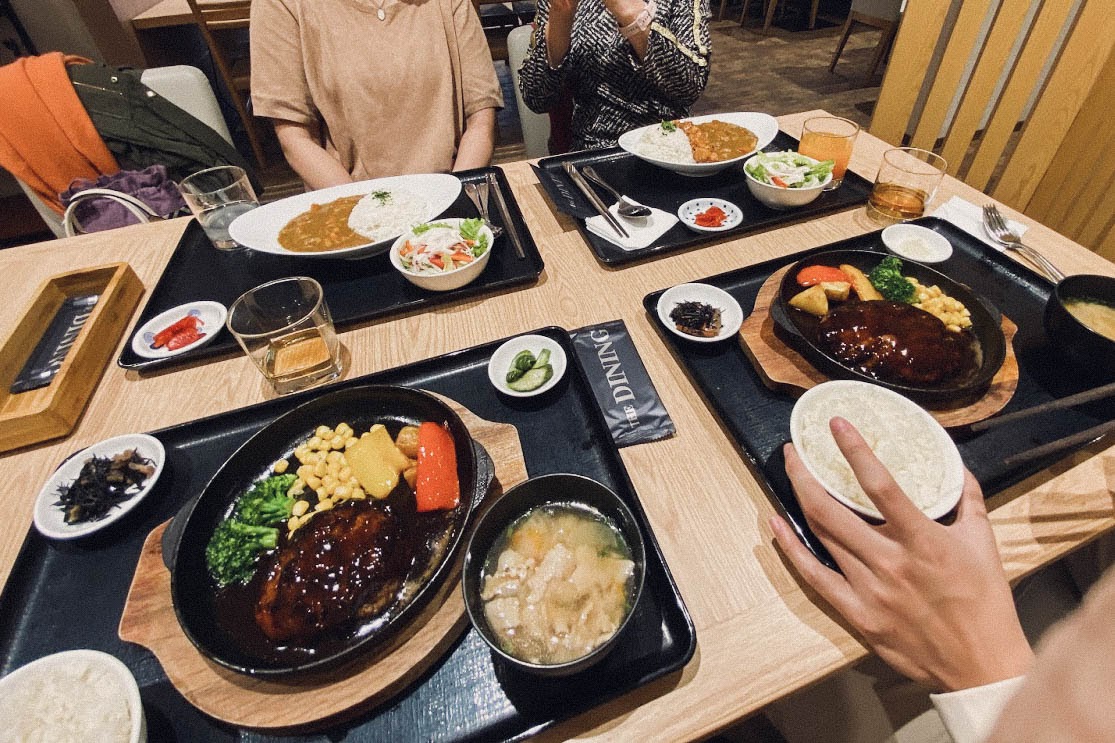 Buổi trưa mình dẫn mẹ, em trai và cô người Nhật sống cùng (nhà mình vừa ở vừa cho thuê) đến nhà hàng Nhật bên trong khách sạn nơi mình thực tập suốt 3 tháng qua. Hồi đi thực tập thi thoảng mình có ghé vào nhà hàng để ăn set cơm trưa Nhật. 5 lần vào thì 4 lần đều gọi món cơm Hamburger sốt demi-glace. Hamburger ở Nhật có hai cách hiểu, một là bánh hamburger hay ăn ở McDonald, Burger King, mà người Nhật phát âm là Hamba-ga-. Còn một cái khác là Bít tết Hamburg (Hamba-gu), là miếng bít tết rán được làm từ thịt băm, sau đó được rưới sốt, ví dụ như sốt cà chua hay sốt demi-glace. Lần này mình cũng gọi set hamba-gu. Em trai cũng gọi set y hệt, có điều của cậu em là 300g trong khi của mình là 200g. Mẹ và cô Nhật đều gọi suất cơm cà ri. Mặc dù ở nhà vẫn hay tự nấu cà ri, nhưng cà ri ở nhà hàng đem lại một hương vị khác hẳn, có phần “sang hơn”, và ngon hơn. Đây cũng là dịp để cho mẹ và em trai tham quan khuôn viên khách sạn nơi mình thực tập, cũng như là đứng check-in dưới cây thông Noel cao hơn 5m.