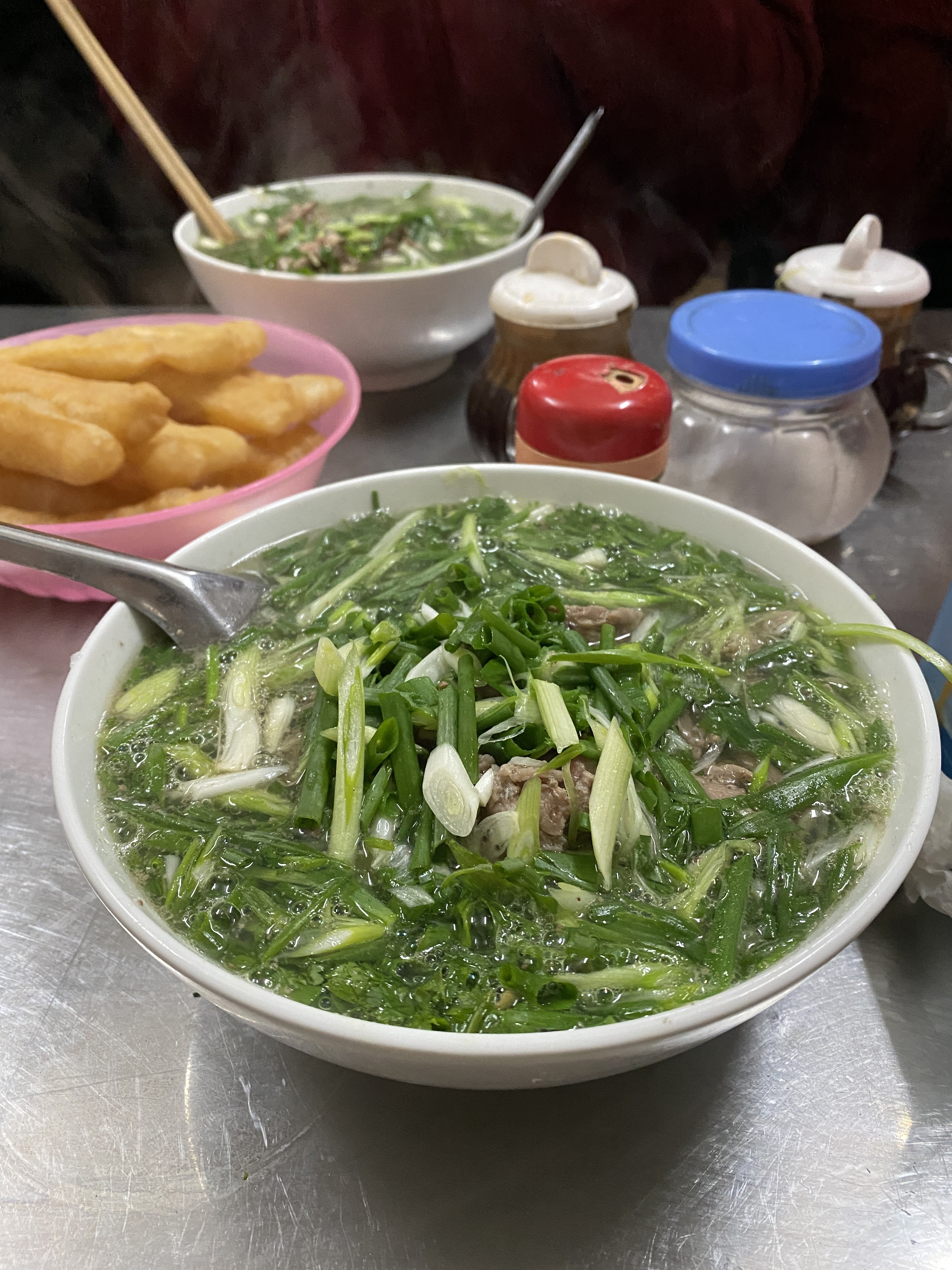 Trừ quẩy thì mỗi bát là 70k. Hình như tăng giá? Mình nhớ là trước đó một bát có giá 60k. Hay là nhớ nhầm chăng? Vừa ngồi xuống bàn, mới kịp cởi khăn len quàng cổ ra thì 3 bát phở đã được bưng đến. Bát nào cũng đầy ự hành. Mình nhớ là chỗ này lúc nào cũng cho nhiều hành như vậy, nhưng lần này thì nhiều đến nỗi không thấy thịt với bánh phở đâu. Cơ mà I like it!