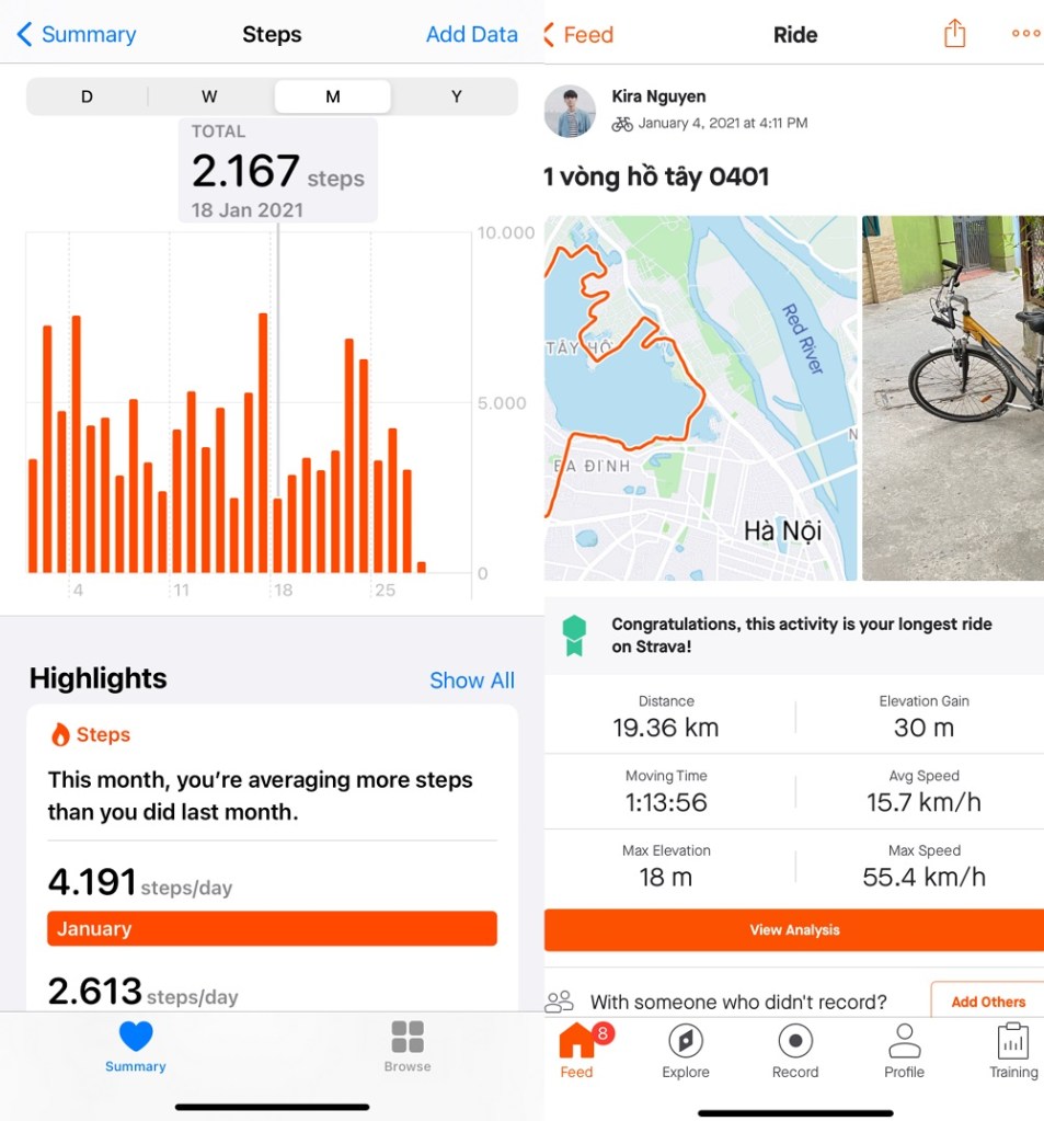 → Từ năm 2021, mình đặt mục tiêu phải đi bộ nhiều hơn 2021 bước mỗi ngày và theo dõi qua ứng dụng Health trên iPhone. Lúc nào muốn ra cafe học, mình sẽ đi bằng xe đạp, và theo dõi lộ trình đạp xe với ứng dụng Strava.