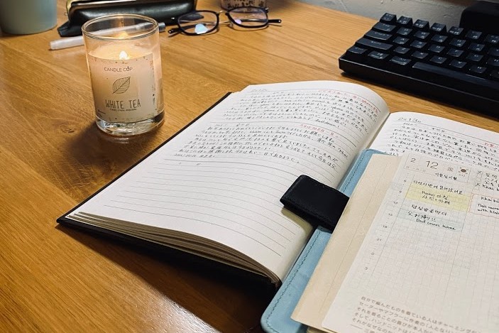 7. Viết thứ ngày tháng và giờ dậy bằng tiếng Hàn vào sổ tay cá nhân. Đây là thói quen được mình hình thành từ tháng 8 năm 2019, với mục đích ban đầu để giúp bản thân không quên chữ Hangul. Thế rồi bây giờ thói quen này nó giống như là một nghi thức giúp mình bước vào khoảng thời gian tĩnh tâm với việc viết.