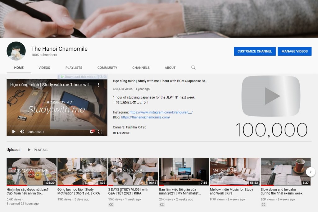 Vậy là sau 1 năm, 7 tháng, 22 ngày (603 ngày), kênh youtube The Hanoi Chamomile của mình đã đạt 100,000 lượt đăng ký và theo dõi. Congrats to me! Yay!