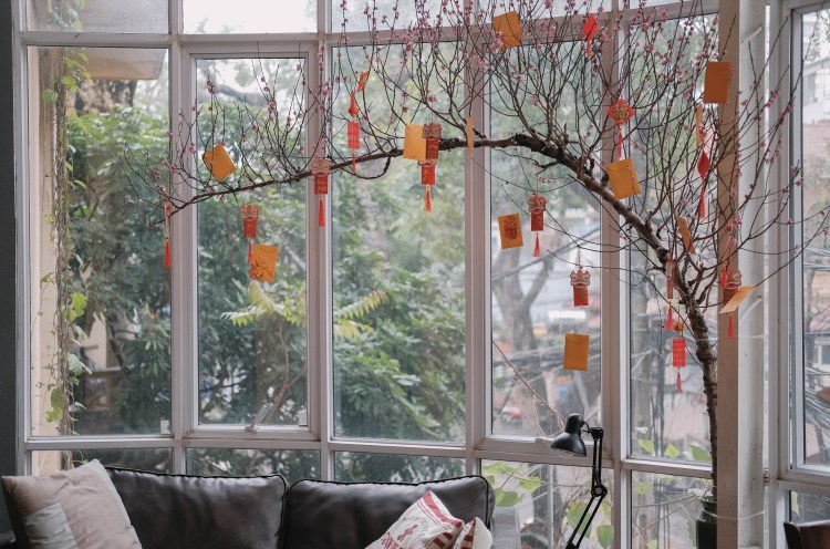 Lâu rồi mới ghé vào Biểu, ấn tượng đầu tiên chính là cành đào được đặt ở góc sofa, trông rất đẹp. Hoa đào vẫn nở, trên cành treo một số vật trang trí, khiến mình cảm thấy như hôm nay mới chỉ là mùng 4, mùng 5 vậy.