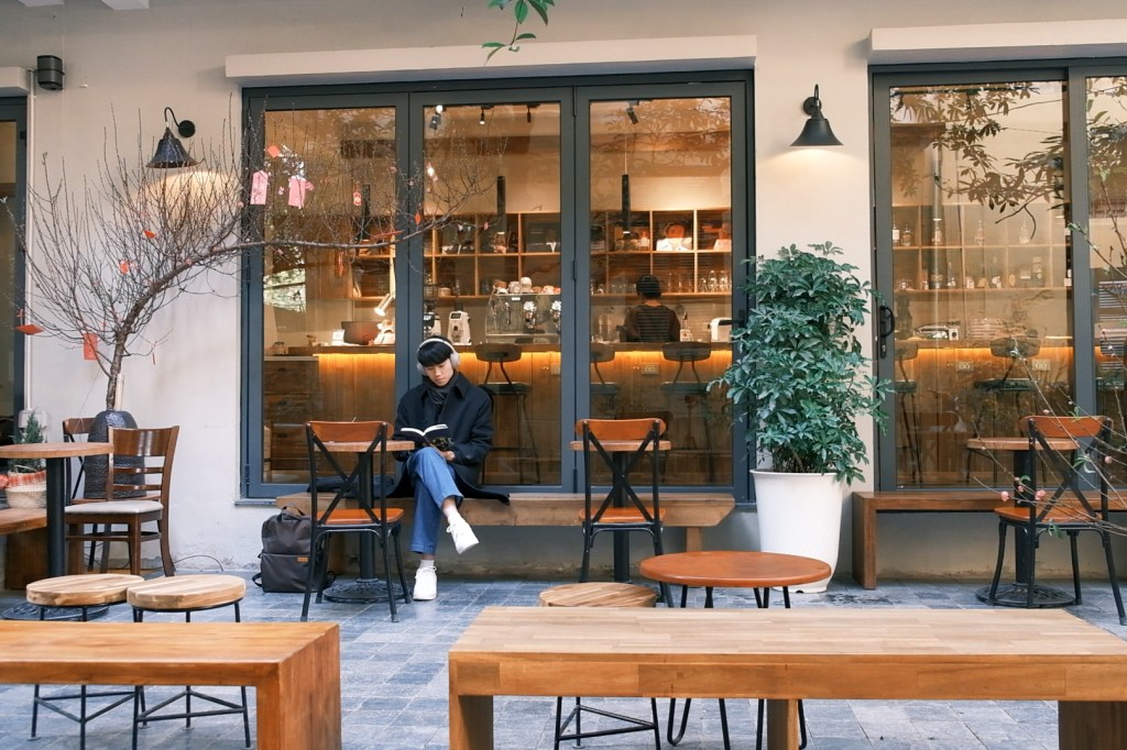 Gọi đồ uống xong, mình ra bên ngoài ngồi. Thời tiết Hà Nội buổi sáng hôm nay rất rất đẹp, cơ mà cũng lạnh không kém. Dẫu vậy thì mình vẫn ngồi ngoài, một phần vì muốn được tận hưởng không khí lạnh khô đến buốt cả tay, một phần vì muốn chụp ảnh, quay video một chút.
